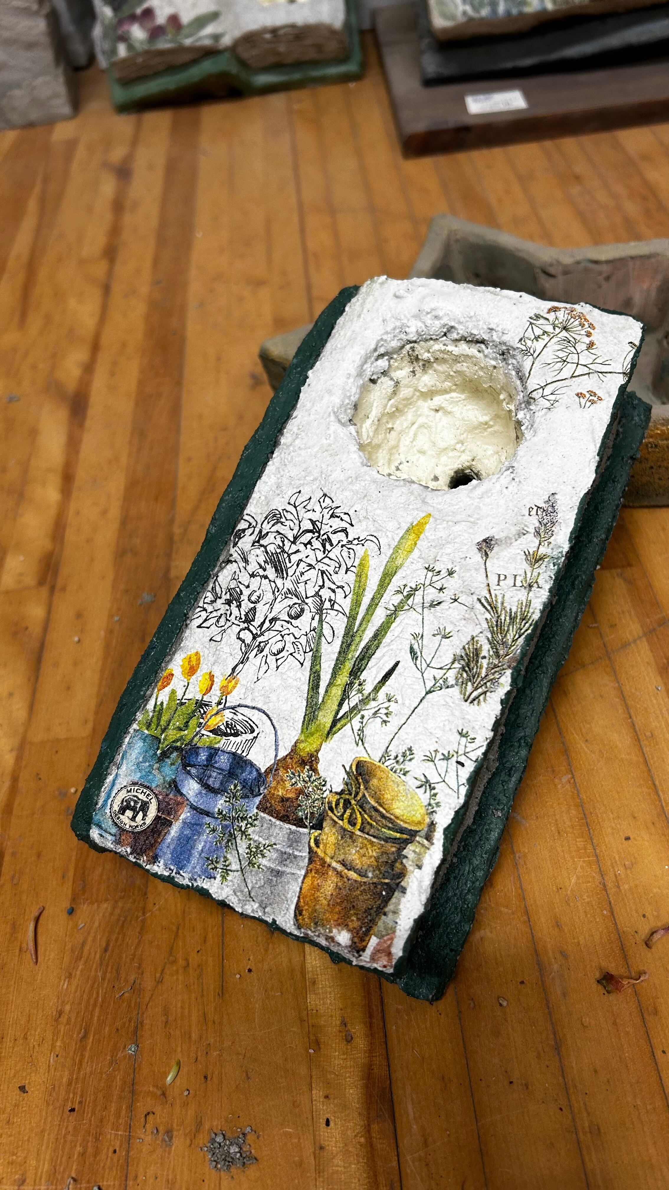 凸凹した表面のマチエールが自然の温もりと風合いを感じさせ、デコパージュで描かれたアートが華やかさを加えています。