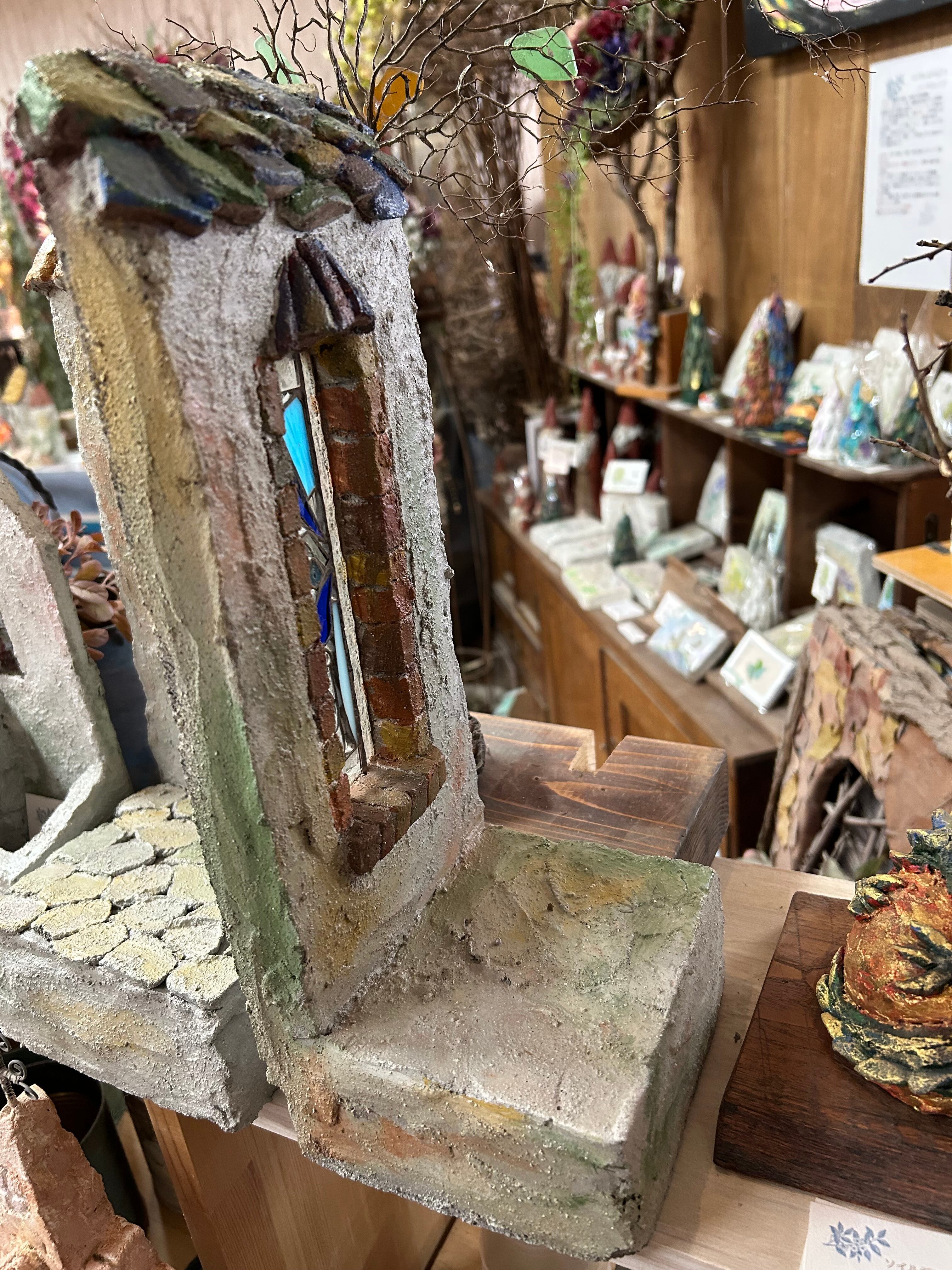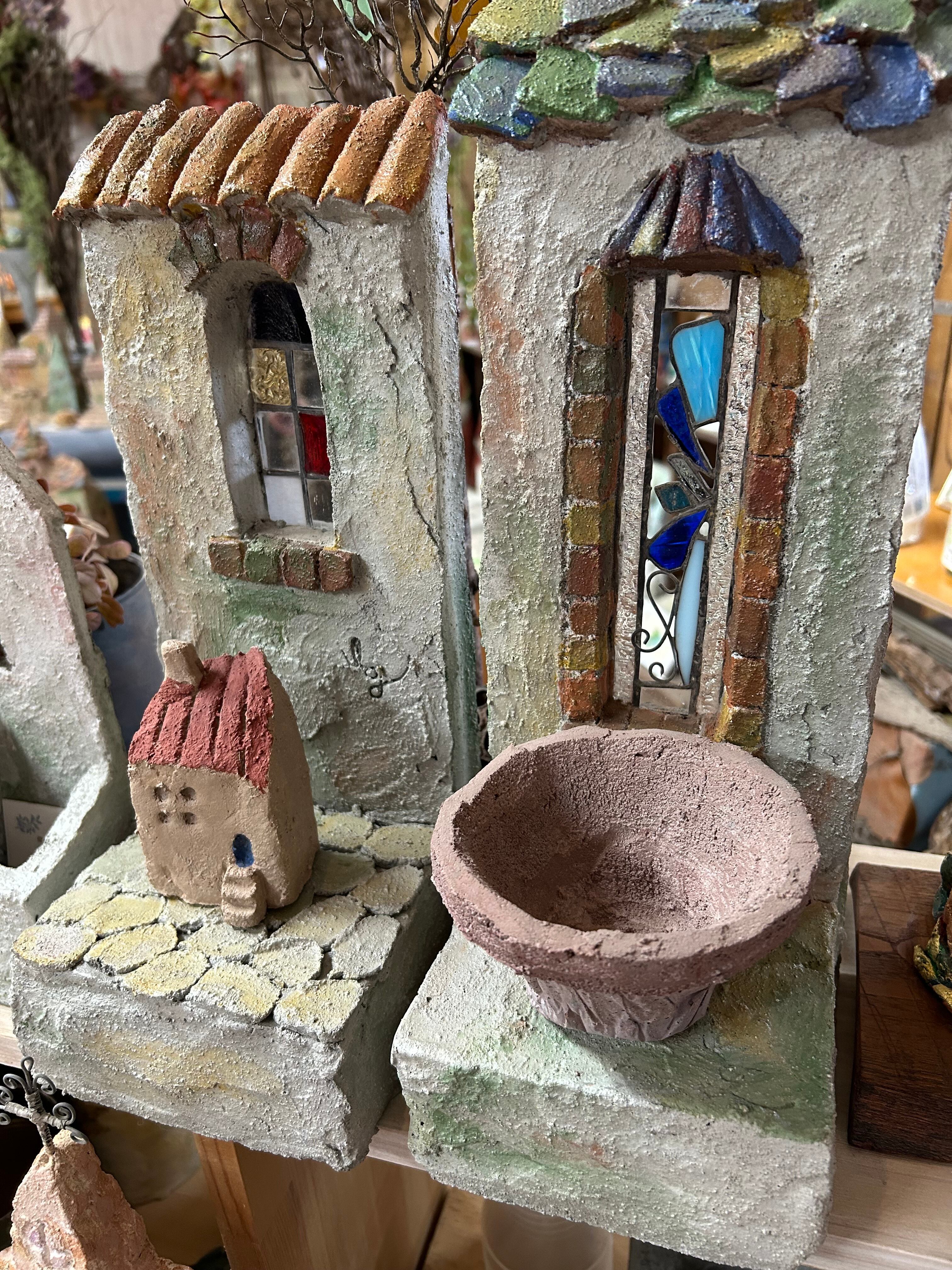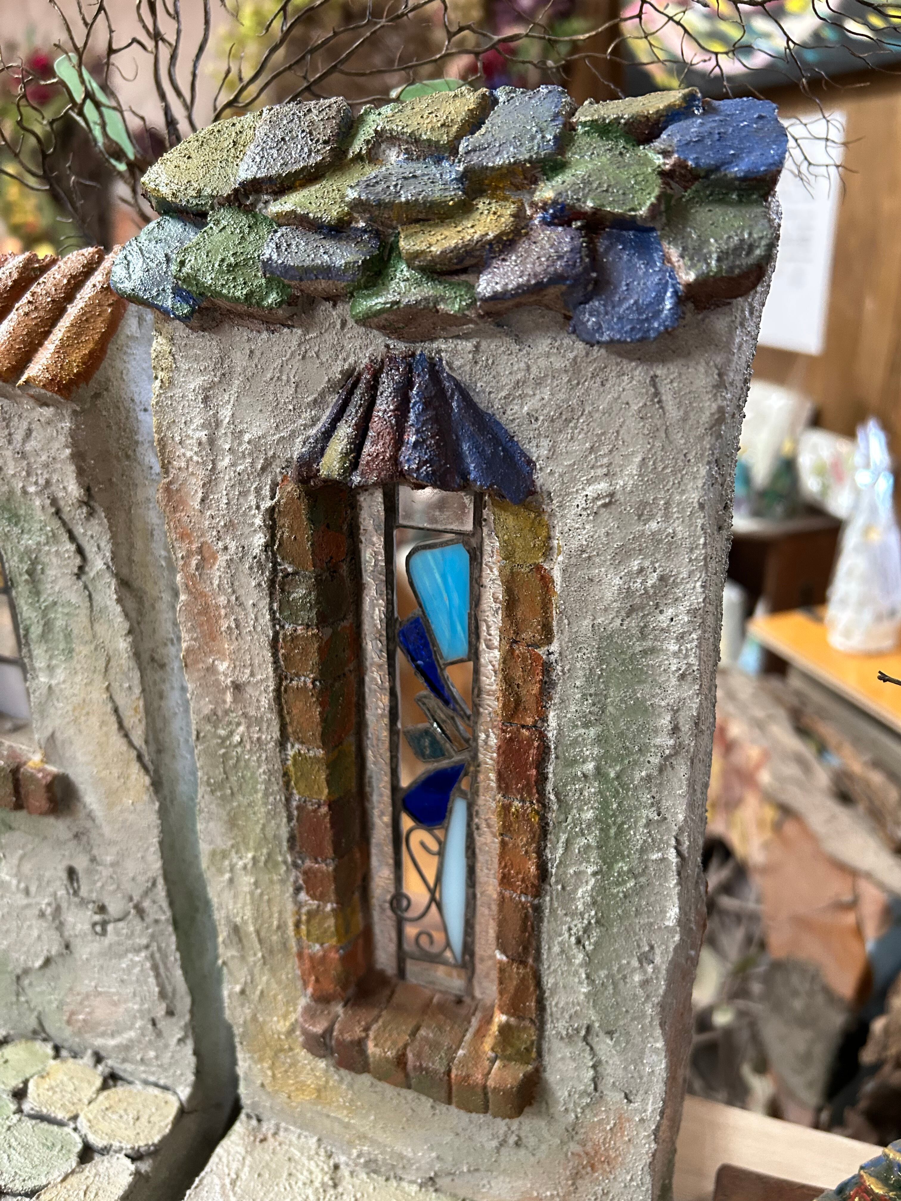 テラコッタの蒲鉾屋根の家壁に赤いステンドグラスが入っています